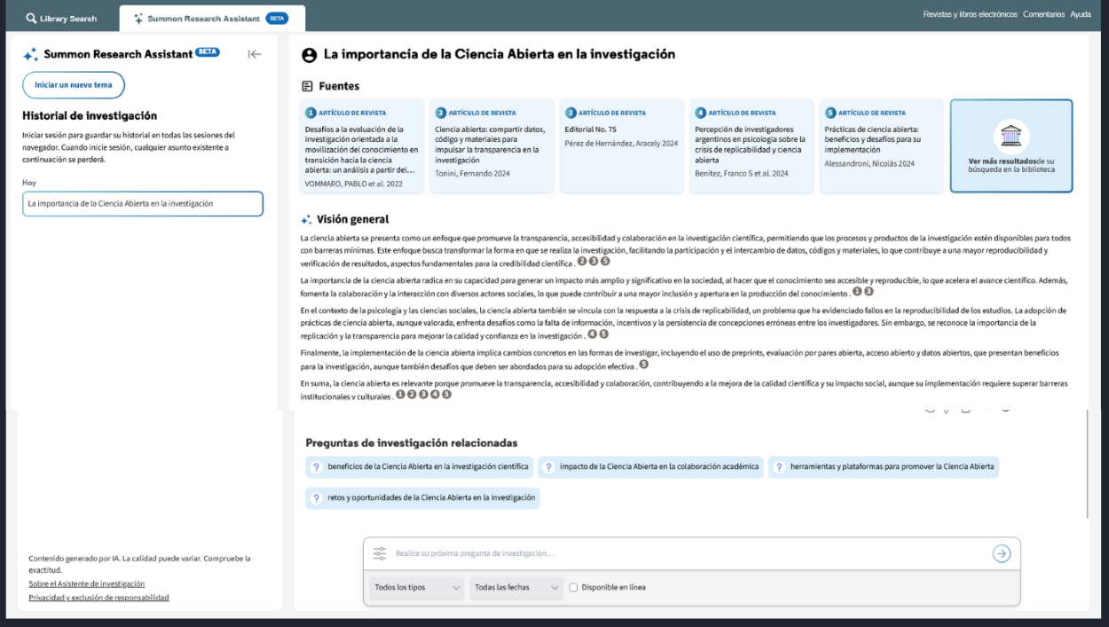 Esta herramienta genera las respuestas a partir de los contenidos que se encuentran en el Buscador: bases de datos, portales de libros-e y revistas-e suscritas y de acceso abierto.