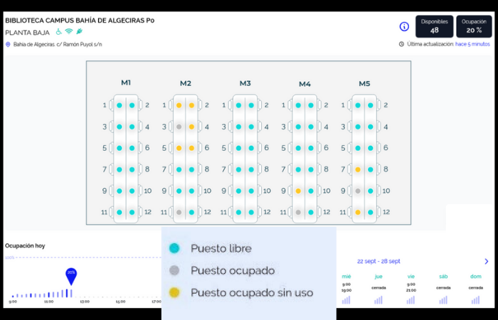 Se puede comprobar la ubicación de los puestos libres y ocupados en tiempo real en las salas de lectura en el siguiente enlace: