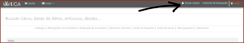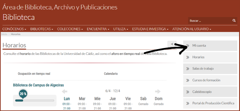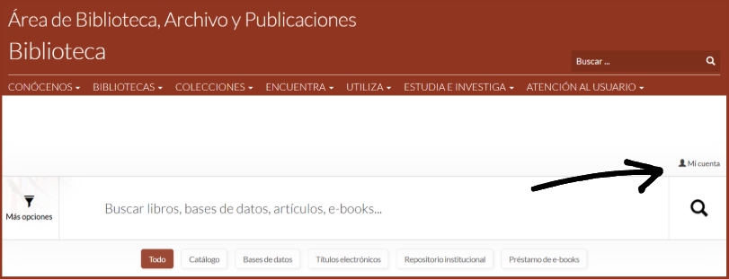 Desde Mi cuenta se pueden consultar todos los servicios referente a la circulación que ofrece la Biblioteca de la UCA. En la página web siempre se encontrará un acceso directo a la cuenta, como se muestra en las siguientes imágenes: