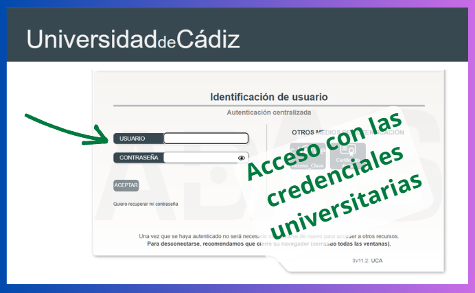 Activada la cuenta, para el acceso diario se podrá acceder o bien con contraseña propia o empleando las credenciales universitarias tal y como se muestra en la imagen siguiente.