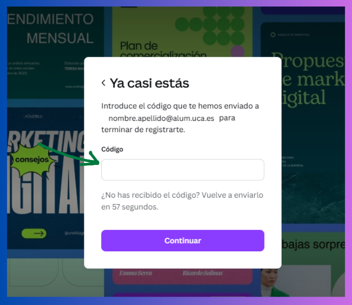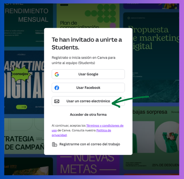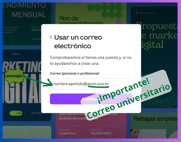 A continuación, se incluye una breve guía con los pasos necesarios para completar el proceso de registro y acceso. También se puede consultar esta Guía de acceso a Canva para estudiantes.