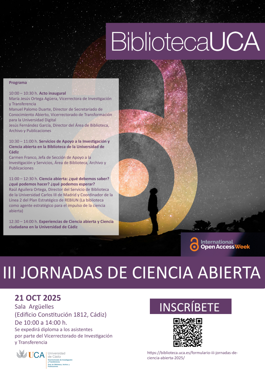 Con motivo de la Semana Internacional del Acceso Abierto, que se celebra este año del 20 al 26 de Octubre, la Biblioteca de la Universidad de Cádiz celebra las III Jornadas de Ciencia Abierta en colaboración con el Vicerrectorado de Investigación y Transferencia, contribuyendo a la difusión del movimiento de Acceso Abierto dentro de la comunidad universitaria de la UCA.
