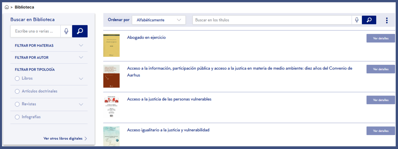 - Biblioteca: da acceso a libros, revistas, artículos doctrinales e infografías, permitiendo establecer filtros por materia, autor y tipología.