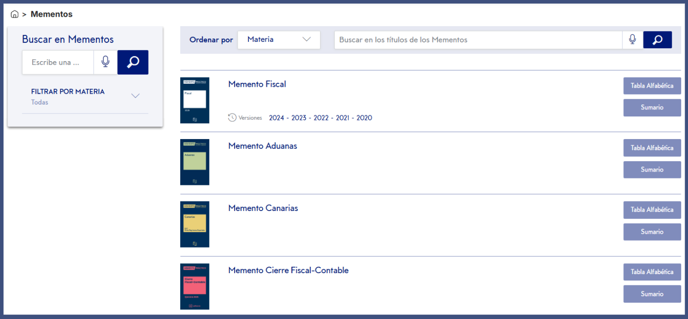 - Mementos: presentan soluciones prácticas con análisis de expertos y ejemplos para resolver dudas jurídicas. Los mementos seleccionados abarcan distintos tipos de derecho: administrativo, civil, tributario, mercantil, urbanístico-inmobiliario, procesal y penal. Desde cada uno de ellos se puede navegar a los documentos que citan, o se puede acceder también desde las fuentes a la parte concreta del Memento.